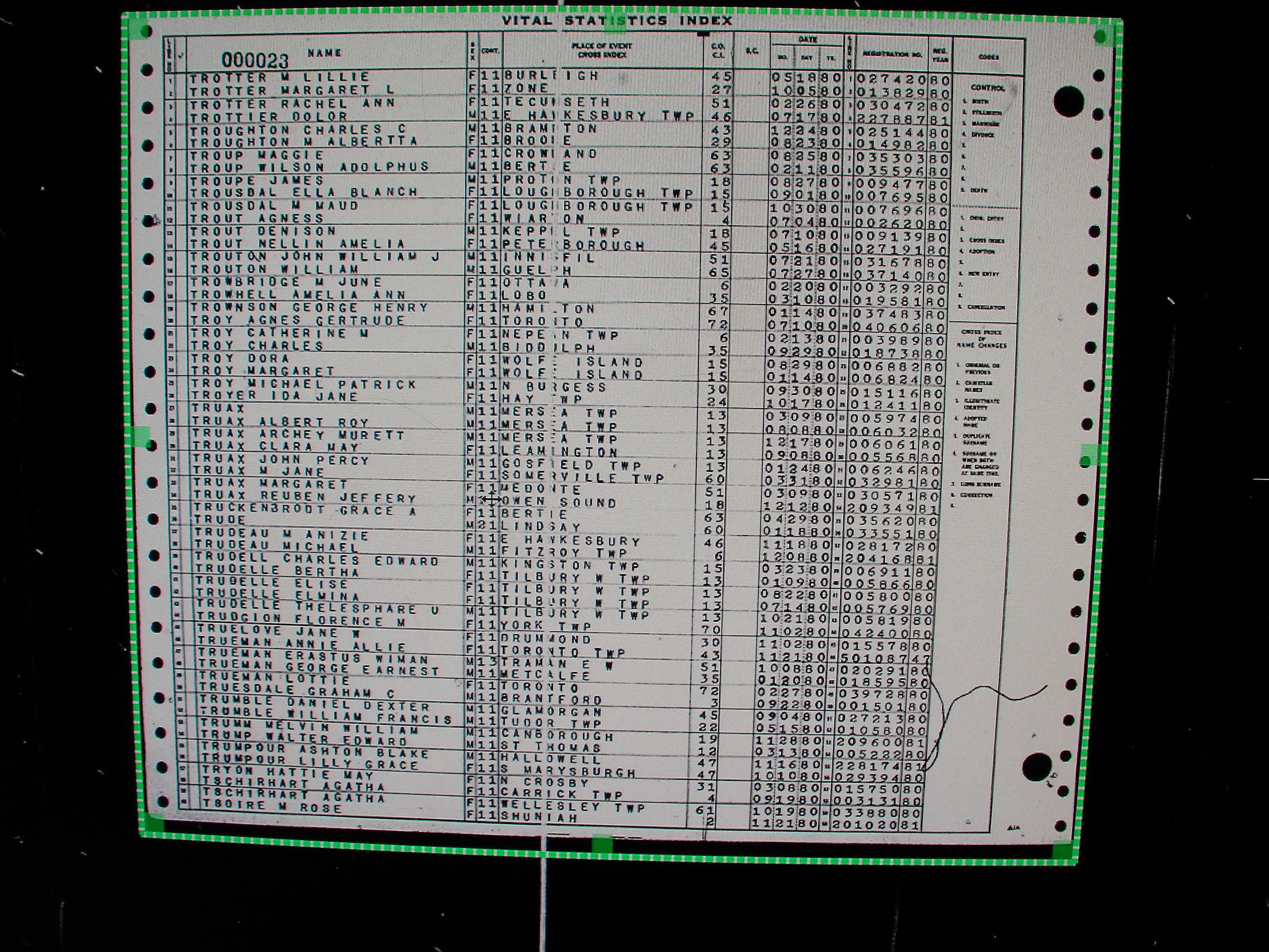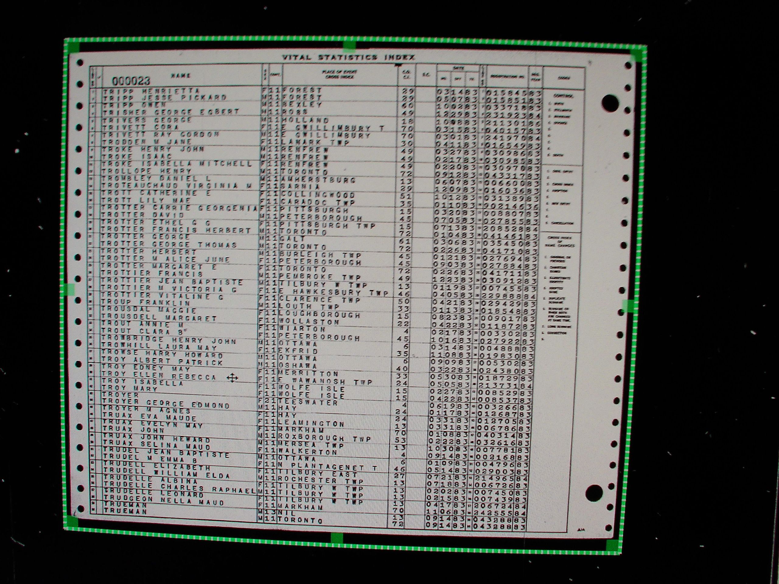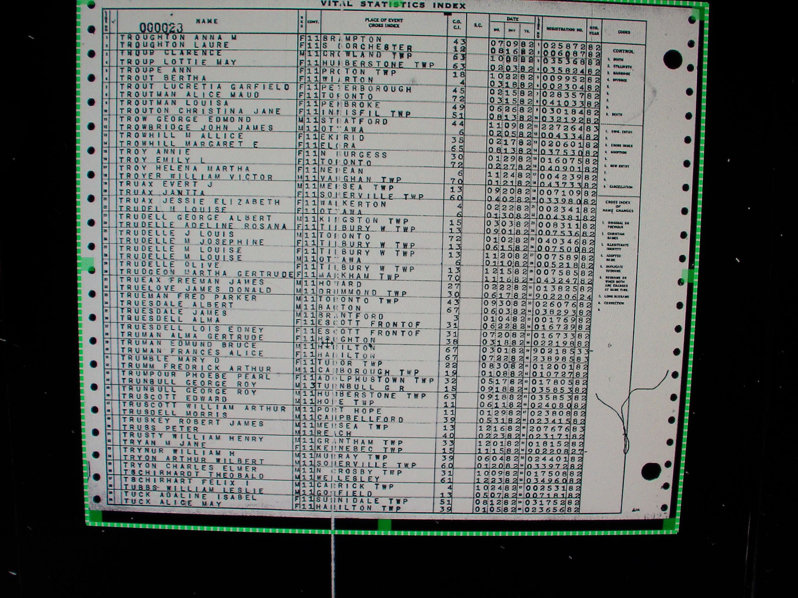 13: Ontario's archived birth certificates are indexed in rolls of microfiche, such as this one.